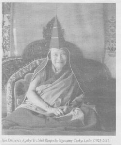 Dudjom Rinpoche, Jigdrel Yeshe Dorje (1904–1987) was a highly revered Buddhist meditation master and the leader of the Nyingma lineage of Tibetan Buddhism. He also traveled and taught extensively, proving instrumental in bringing Buddhism to people in Europe, North America, and other parts of Asia. He founded a teaching and meditation center in Dordogne, France in 1980, where he lived until his death in 1987.