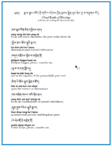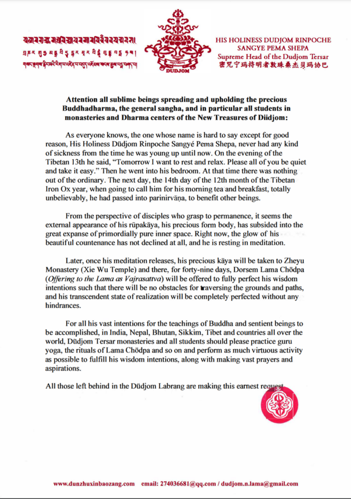 This was written by Sangye Pema Shepa, the one bearing the title “Dudjom Incarnation,” on Ḍākinī Day in the eighth month of the Tibetan Earth Dog year [October 4, 2018]