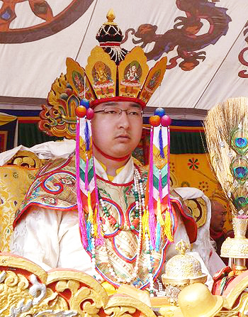 This great being’s reincarnation is the supreme Nirmāṇakāya emanation Sangye Pema Shepa Drodul Rigdzin Trinley Drupe De, also known as Pema Ösel Pal Zangpo. His father was the great holy Treasure Revealer’s own son, Dola Choktrul Jigme Chökyi Nyima, and his mother is Pema Khandro, who has all the marks and signs of a Ḍākinī. In the year of the Iron Horse [1990], the lotus of his perfect form blossomed anew amid many amazing, auspicious signs.