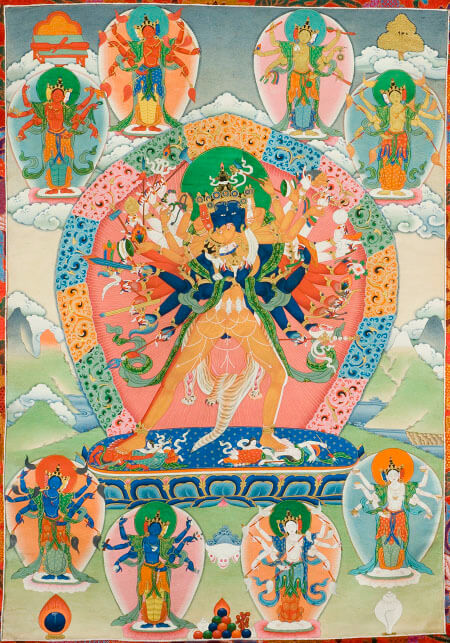 For daily practice, many would continue to use a two-armed Kālacakra practice, or something like a nine-deity maṇḍala practice, in which 24-armed Kālacakra is surrounded by the eight śaktīs (nus ma brgyad) and four emblems (see the image on the right). The next most extensive form of practice is a mind-maṇḍala practice, in which the central lotus is surrounded by four buddhas and their consorts, six bodhisattvas and their consorts, and certain wrathful deities and offering goddesses. This could be used as a daily practice, but is mainly used as a retreat practice.