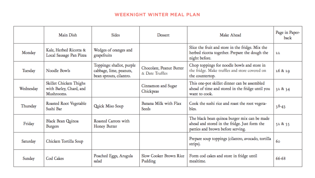 Need some inspiration for your weekly meal planning? Sarah Waldman, nutritionist, mom, and author of Feeding a Family (now in paperback) is here to help! She has put together a schedule of a whole week of wintery meals for your family, with a complete shopping list to make things easy.